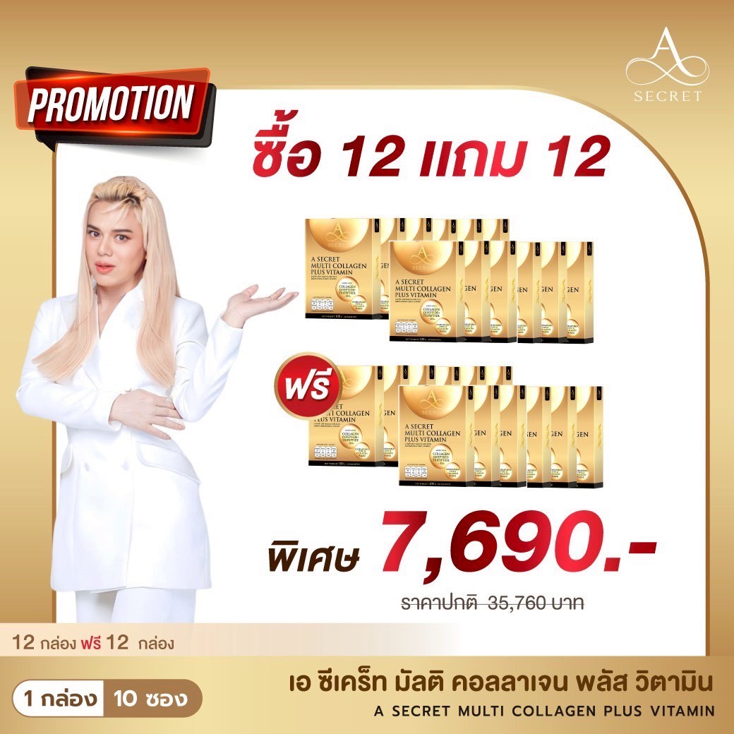 โปรโมชั่น A Secret Collagen 12 แถม 12 กล่อง ราคา 7,690.- ส่งฟรี